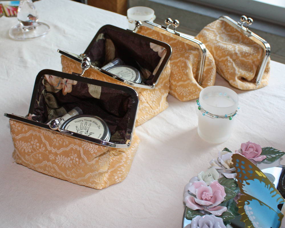 These were some lovely little clutch purses that I made to show how unique bridesmaid gift sets can be made using our skincare products. See how the inside fabric on the clutches matches the table skirt? These were fun to make. You should try it!